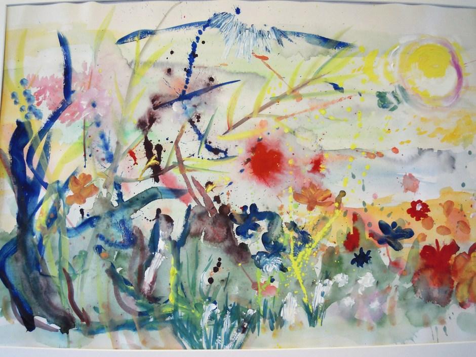 "Ihmemaa"; kuuden akvarellistin yhdessä maalaama teos. (Kuva: Riitta Brelih)