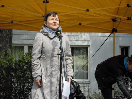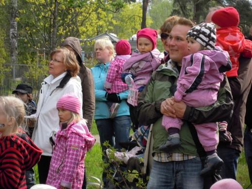 Seuran puheenjohtaja toivotti kaikki tervetulleiksi tapahtumaan. Lämpötila oli +10 asteen paikkeilla ja myrskyksi saakka yltynyt tuuli riepotteli kevätjuhlaan osallistujia, mutta tunnelma säilyi kuitenkin iloisena ja välittömänä (Kuva: Riitta Brelih).